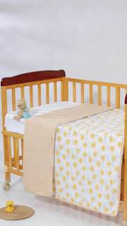 Featuring **printed muslin on one side** and a **solid color muslin on the other**, this reversible design offers versatility and style. The 4-layered muslin construction provides extra warmth without compromising breathability, making it perfect for year-round use.