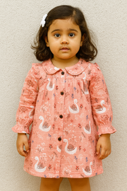 Grace meets comfort in this elegant crinkled muslin frock, featuring a delicate swan and floral print on a soft coral base. Thoughtfully designed with a peter pan collar, wooden buttons, and gentle ruffle detailing on the sleeves, this piece blends timeless charm with everyday wearability. The airy, breathable fabric ensures your little one stays comfortable while looking effortlessly stylish — perfect for special occasions and memorable moments.